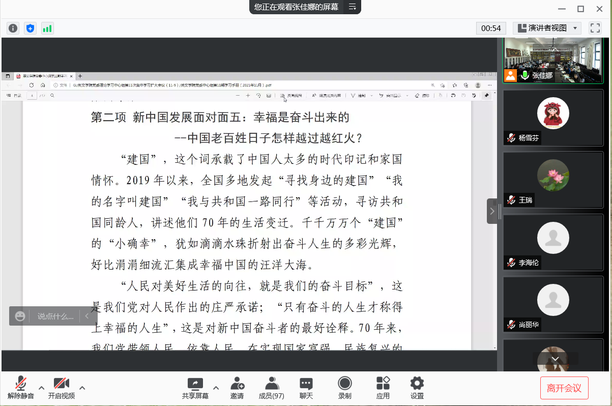 会上,党委副书记马文静领学《新中国发展面对面》第五章“幸福是奋斗出来的”。“只有奋斗的人生才称得上幸福的人生”,这是对新中国奋斗者的最好诠释。人民是共和国的真正缔造者、伟大建设者和最终评判者。要坚持以人民为中心,始终把人民放在心中最高位置,让人民有更多获得感幸福感安全感。党委委员李哲领学《求是》杂志(2021.11期)“在新征程上传承星火赓续血脉”一文,要牢记政治立场,做到以人民为中心不忘本,淬炼政治灵魂,做到坚定信仰不迷航,永葆政治品格,做到自我革命不止步,擦亮政治本色,做到敢于斗争不退却。