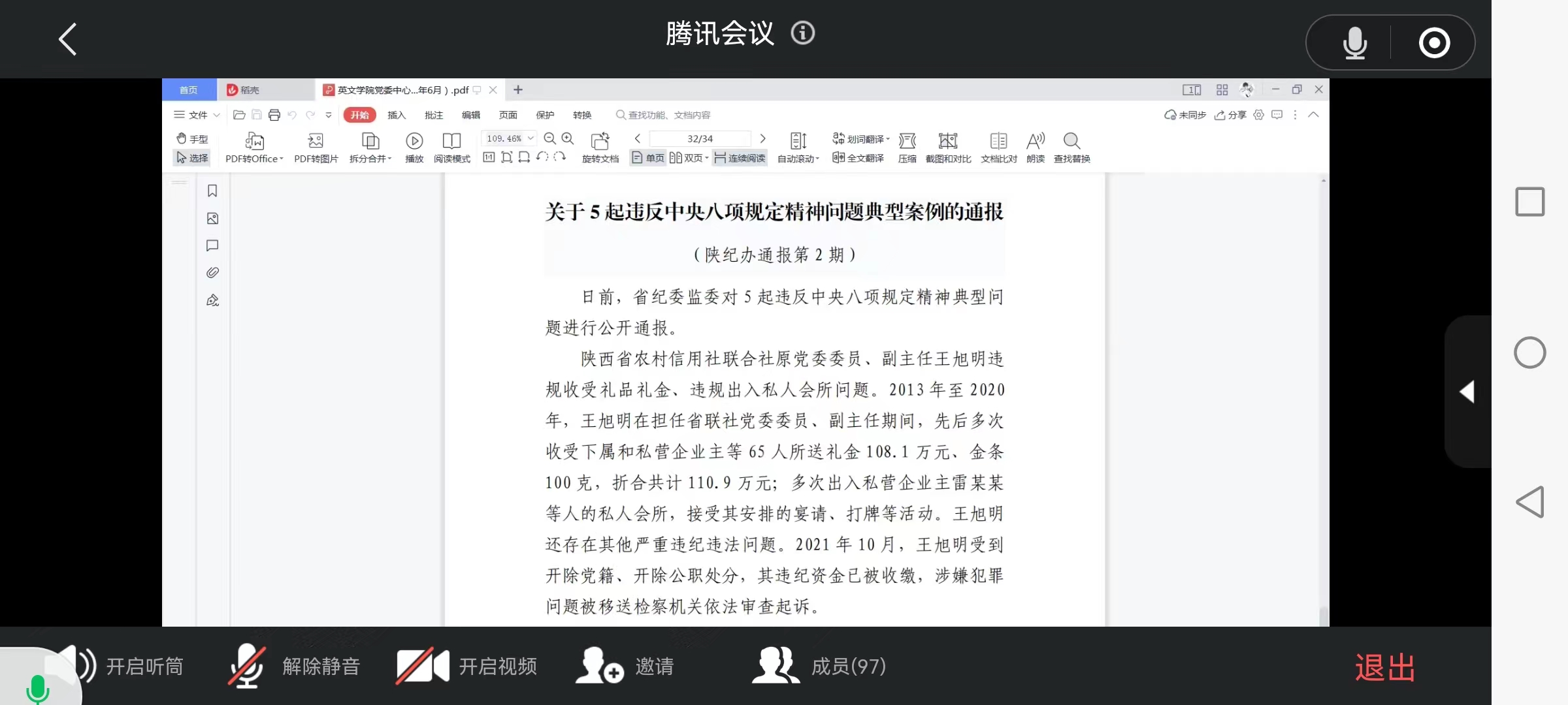 会上,马文静领学习近平总书记在十九届中央纪委六次全会上的重要讲话精神。党委委员雷茜领学《中国共产党纪律检查委员会工作条例》。副院长裴等华领学中共中央办公厅印发《关于加强新时代廉洁文化建设的意见》。副院长赵永刚领学《关于5起违反中央八项规定精神问题典型案例的通报》(陕纪办通报第2期)