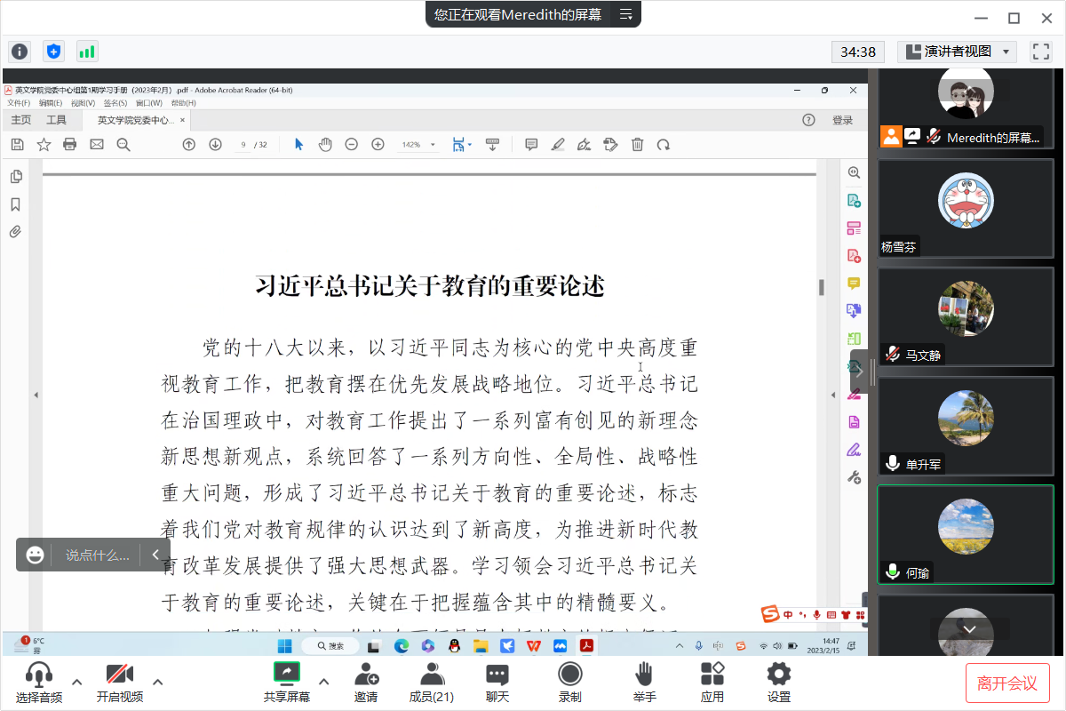 会上,党委副书记马文静传达学习习近平总书记在中央政治局民主生活会上的重要讲话精神,党委委员、国别与跨文化系党支部书记何瑜领学习近平总书记关于教育的重要论述,副院长、大学英语党支部书记徐斌领学党的二十大关于教育的决策部署,副院长雷茜传达中共陕西省委教育工委 陕西省教育厅2023年工作要点。