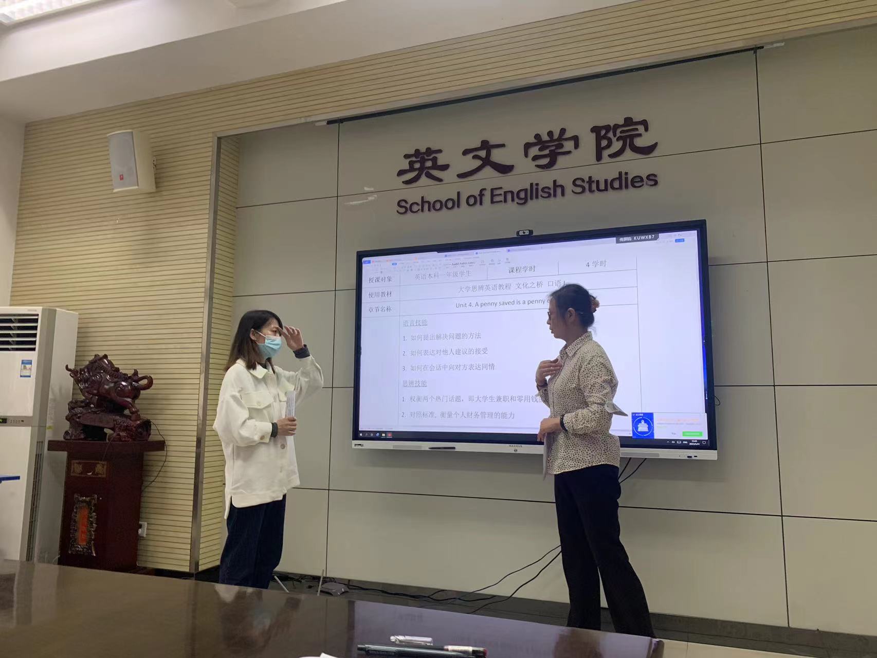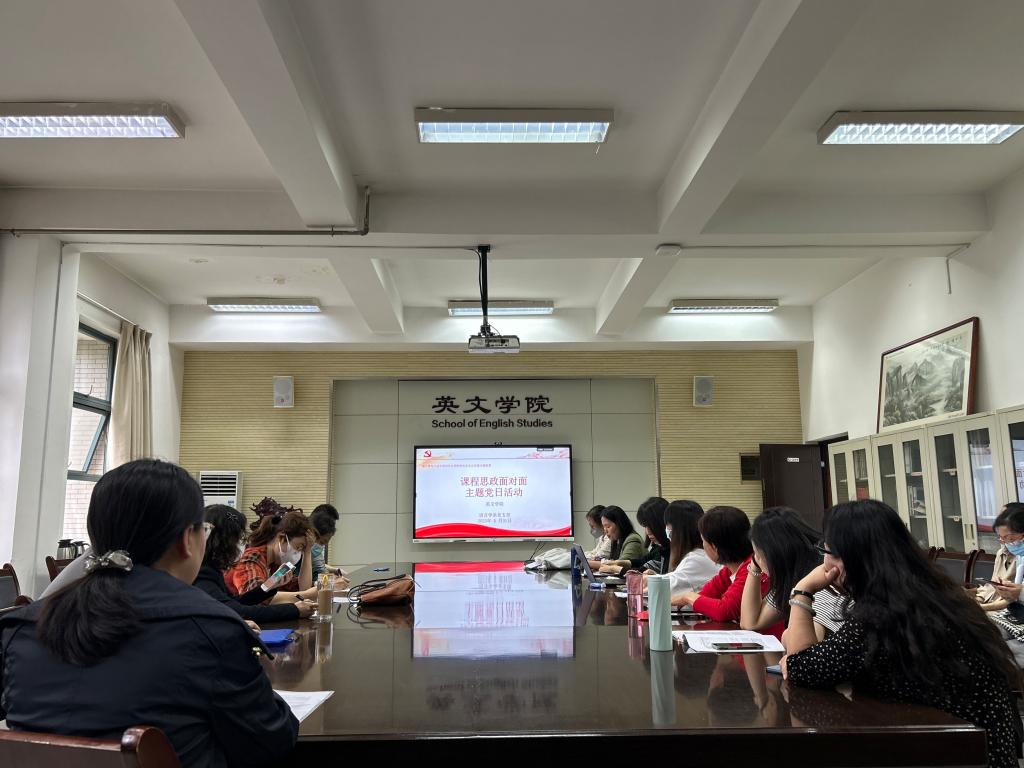 会议开始由王改燕教授领学了习近平主持中央政治局第五次集体学习并发表重要讲话的部分内容,其次由王静副教授结合“课程思政大练兵”展示《口译基础》课程内容并分享参赛感想,王老师总结出课程思政应以课程特色为立足点,思政元素的挖掘需基于课程理论和设计的思路。随后,石琳霏博士、李海伦老师分别展示了各课程思政的授课内容及具体实施步骤,李毅老师根据两位老师的展示内容,从课程思政切入点、选取思路、课程设计逻辑、思政内容升华等方面一一做了精彩点评。