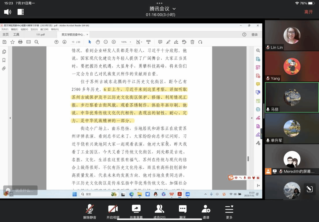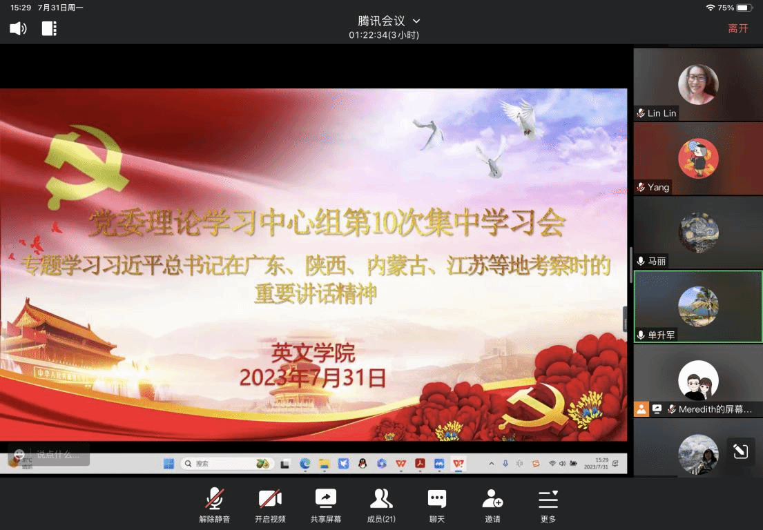 7月31日下午,开云体育 党委理论学习中心组采取线上腾讯会议的方式,组织开展2023年第10次集中学习,专题学习习近平总书记在广东、陕西、内蒙古、江苏等地考察时的重要讲话精神,开云体育 中心组全体成员参会。会议由开云体育 党委书记、中心组组长单升军主持。