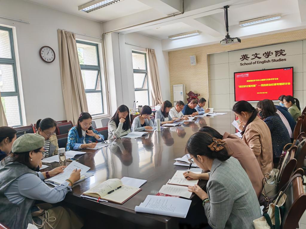 党委副书记马文静、大学英语第二教研室主任李雨蒙、翻译系党支部书记马丽萍及研究生教学秘书乔丹雯分别就党的政治纪律及自己的学习心得进行了交流研讨。马文静结合自身所从事的党员管理教育和学生思想政治工作的实际出发,从铸牢思想防线,提高政治站位;牢牢把握主动,加强教育引导;严明政治纪律,做好带头示范三方面交流了自己的学习心得。李雨蒙从学习党章党规党纪的重要性出发,认为作为高校教师,学习和遵守党章党规党纪,要发挥好带头表率作用,牢固树立党章党规意识,要严以修身、严以律己;要始终坚守党的纪律,保持党的先进性和纯洁性,时刻警醒自己,不断提高自身素质。马丽萍分享了日常教学中引导学生认识法纪的严肃性,在其《阅读与思辨:语言与文化》课程教学中,引导学生从政治立场思考国际传播和民族形象塑造的严肃性,帮助学生认识到网络不是法外之地,舆情无小事,明白外语专业人才的使命和担当,要用一颗红心,发挥外语专业优势,用好网络和信息技术双刃剑,为讲好中国故事传播中国声音而努力读书。乔丹雯主要就近期学习党纪的心得进行分享,她认为作为党员干部,要在做到“两个维护”上旗帜鲜明,要在遵守党规党纪上从严从紧,要在保持清正廉洁上模范带头,要把学习与实践深度结合,切实把《条例》学习作为今后重要政治任务。