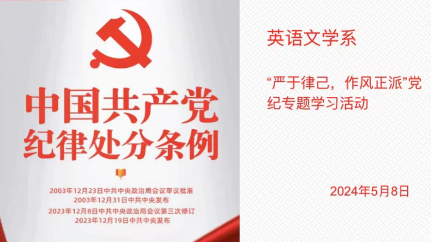 英语文学系于线上举办“严于律己,作风正派”党纪专题学习活动。支部书记贾宏涛领学《习近平总书记关于加强政治纪律建设的重要论述》,梁园园和张媛领学《条例》第六章“对违反政治纪律行为的处分”,薛小惠和郑燕领学《条例》第七章“对违反组织纪律行为的处分”。之后,与会教师集体观看了秦岭违建警示教育片,从宏观到微观体悟党纪违规给人民以及国家造成的严重损失。与会教师表示将以这次学习教育为契机,进一步加强党性修养和纪律意识,不断提升政治素质,坚定理想信念,并在日常教学中落实好实践好立德树人这一根本任务。