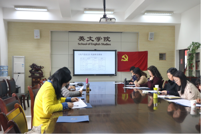 翻译党支部在会议室里,党员们以接力诵读的形式,开展了一场以“重温红色经典,感悟初心力量”为主题的汉英双语接力诵读《共产党宣言》主题党日活动。