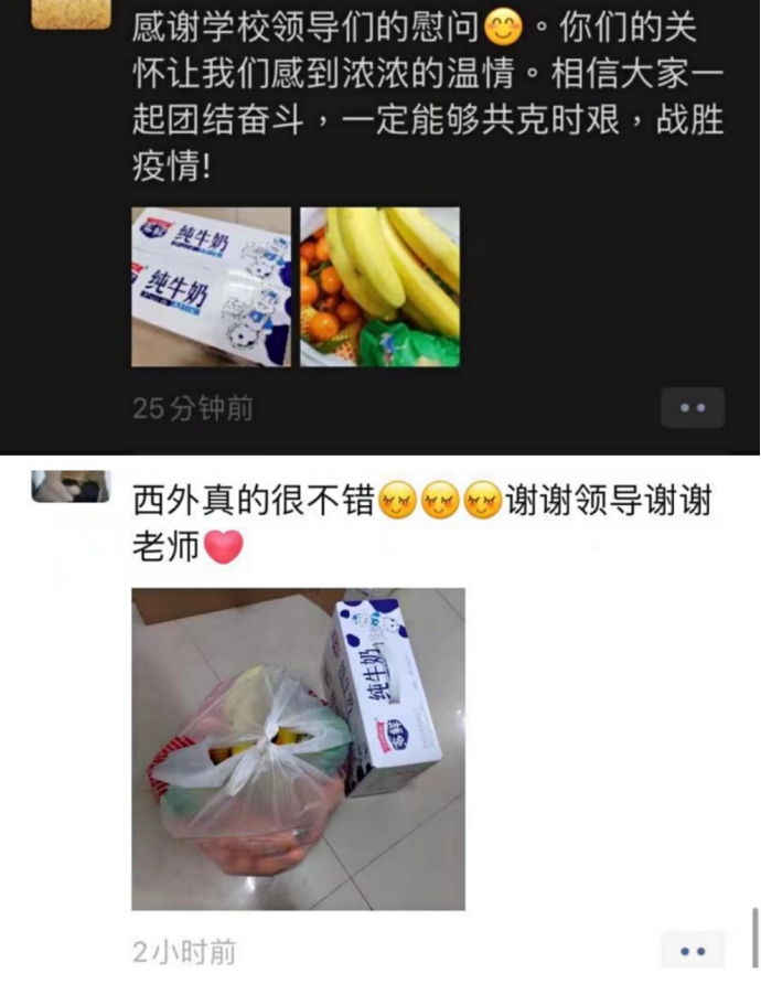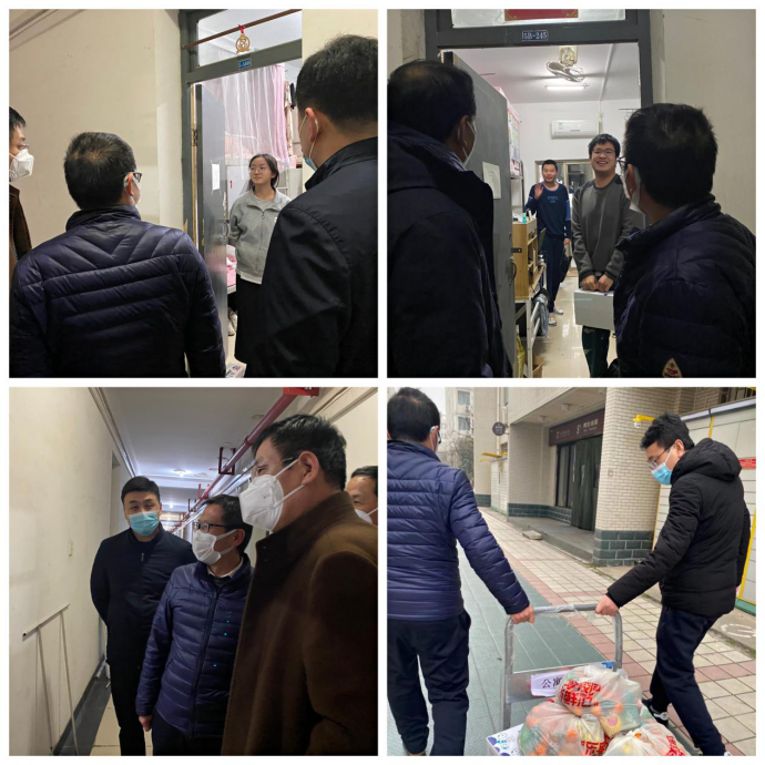 领导及各年级专兼职辅导员一行前往隔离宿舍慰问学生,重点慰问了17间宿舍集中隔离C类或黄码学生,他们询问隔离学生的困难,叮嘱同学们在隔离的同时也要制定好学习计划,保证劳逸结合。