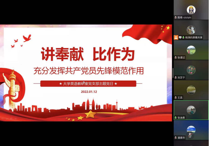 大学英语教研室(支部)开展了“讲奉献 比作为,充分发挥共产党员先锋模范作用”的主题党日活动,与会党员就近期各自在研究生监考、志愿者活动、疫情防控等方面的做法和感悟进行了交流分享。
