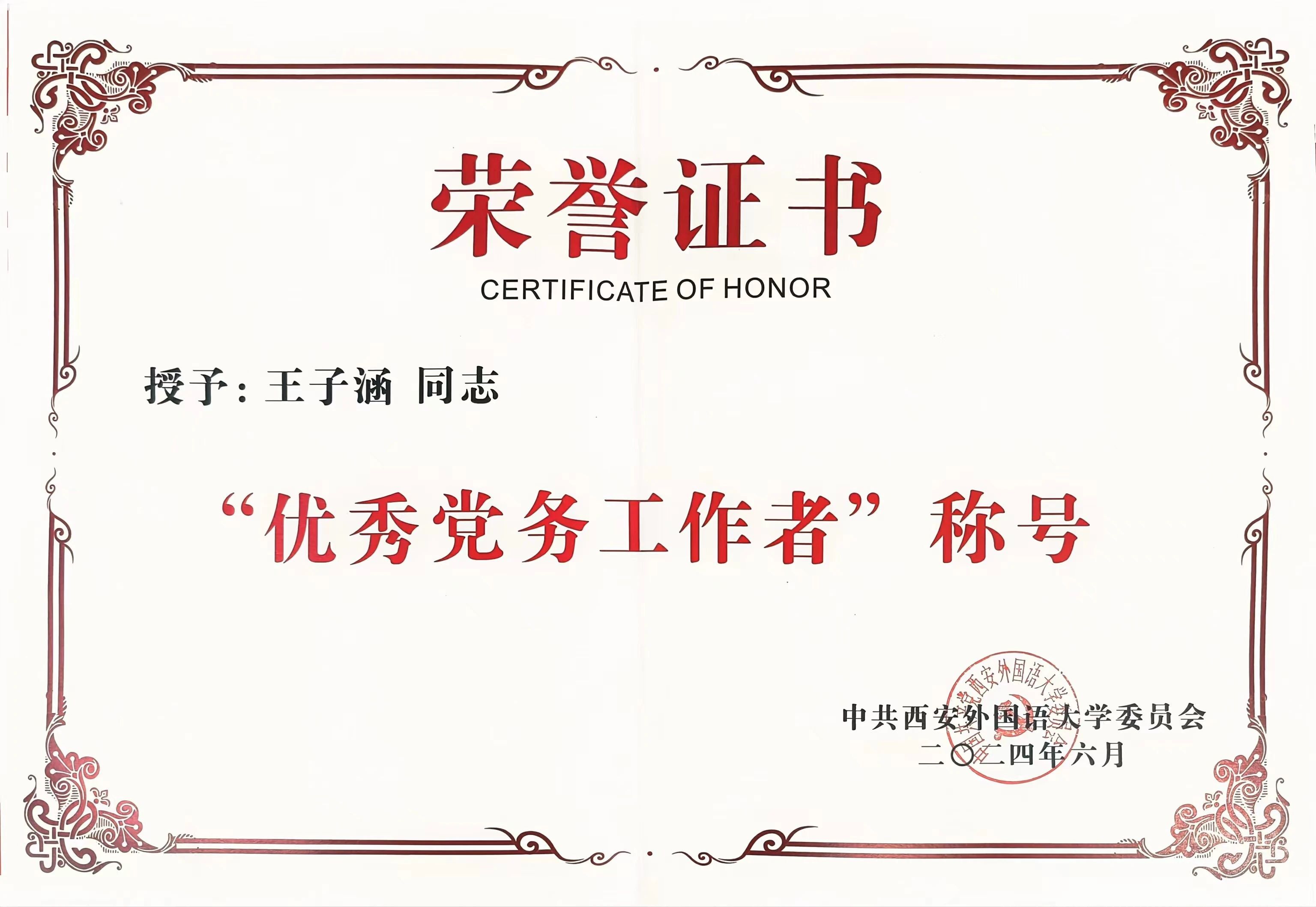 大会宣读了《关于表彰优秀共产党员、优秀党务工作者和先进基层党组织的决定》(西外党发〔2024〕23号),开云体育 马丽萍老师荣获教职工“优秀共产党员”称号,王佳、林义壮、郭慧敏、潘岳恒4名同学荣获学生“优秀共产党员”称号,王子涵老师荣获“优秀党务工作者”称号。