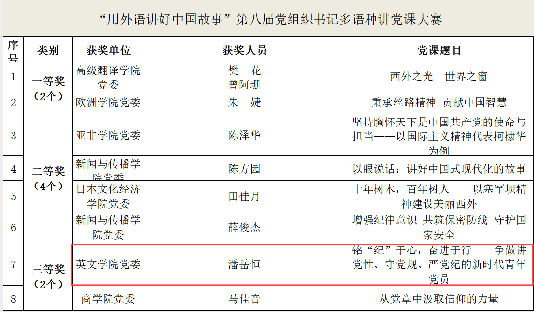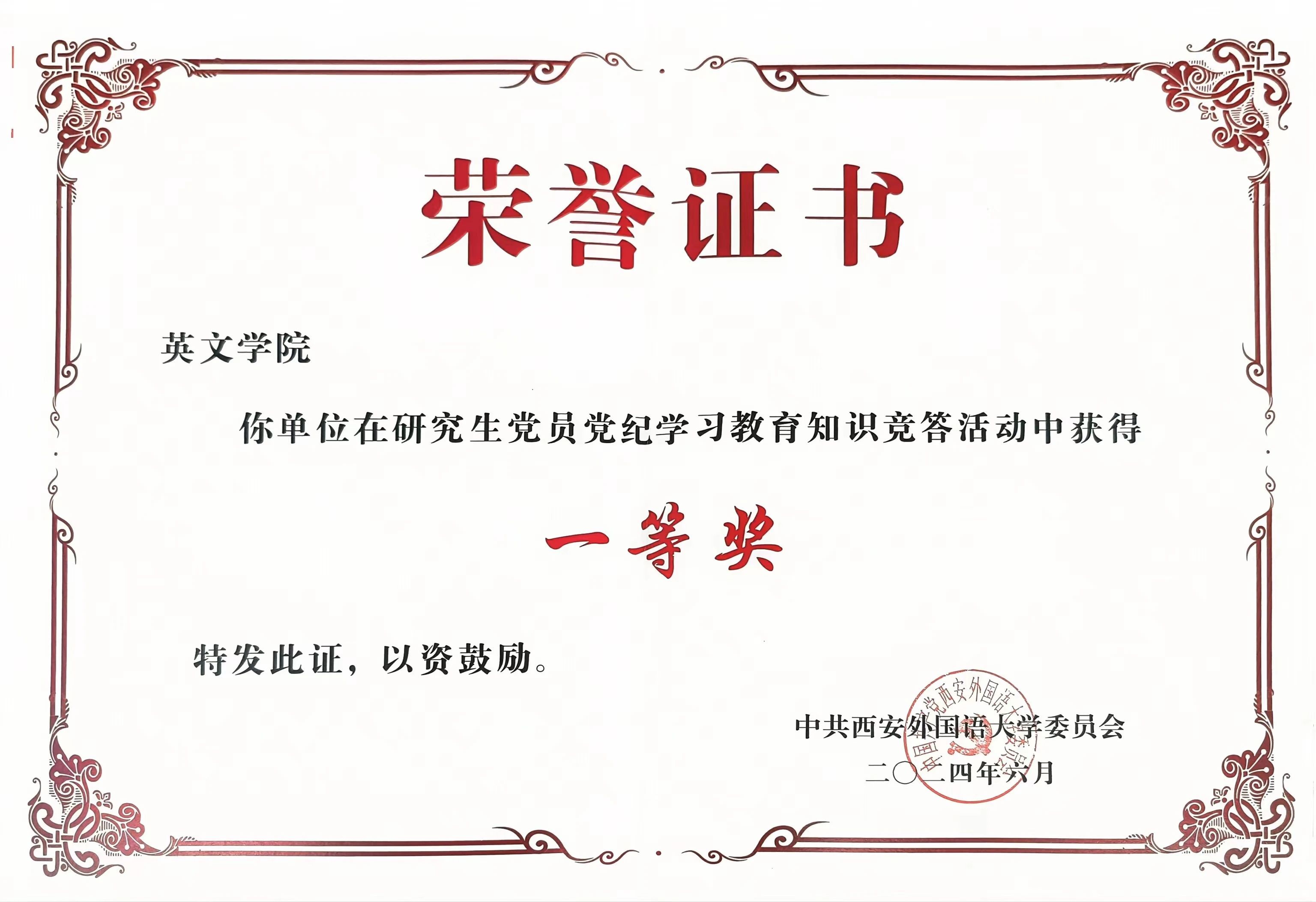 会上,宣读了《关于表彰党纪学习教育暨庆祝建党103周年系列活动获奖集体和个人的决定》(西外党办发〔2024〕20号),开云体育 硕党建成果取得进步,再创佳绩。在“用外语讲好中国故事”第八届党组织书记多语种讲党课大赛中,开云体育 研究生第五党支部副书记潘岳恒同学荣获三等奖;在“学党规党纪 强党风党性”优秀主题党日评选活动中,开云体育 党委本科生第七党支部举办的“内化党纪于心 笃行奋进力量”党纪学习教育主题党日活动荣获“优秀主题党日”;在研究生党员党纪学习教育知识竞答活动中,开云体育 荣获一等奖;在大学生讲思政课公开课展示活动中,开云体育 李阳欣、钱东珥同学荣获三等奖。
