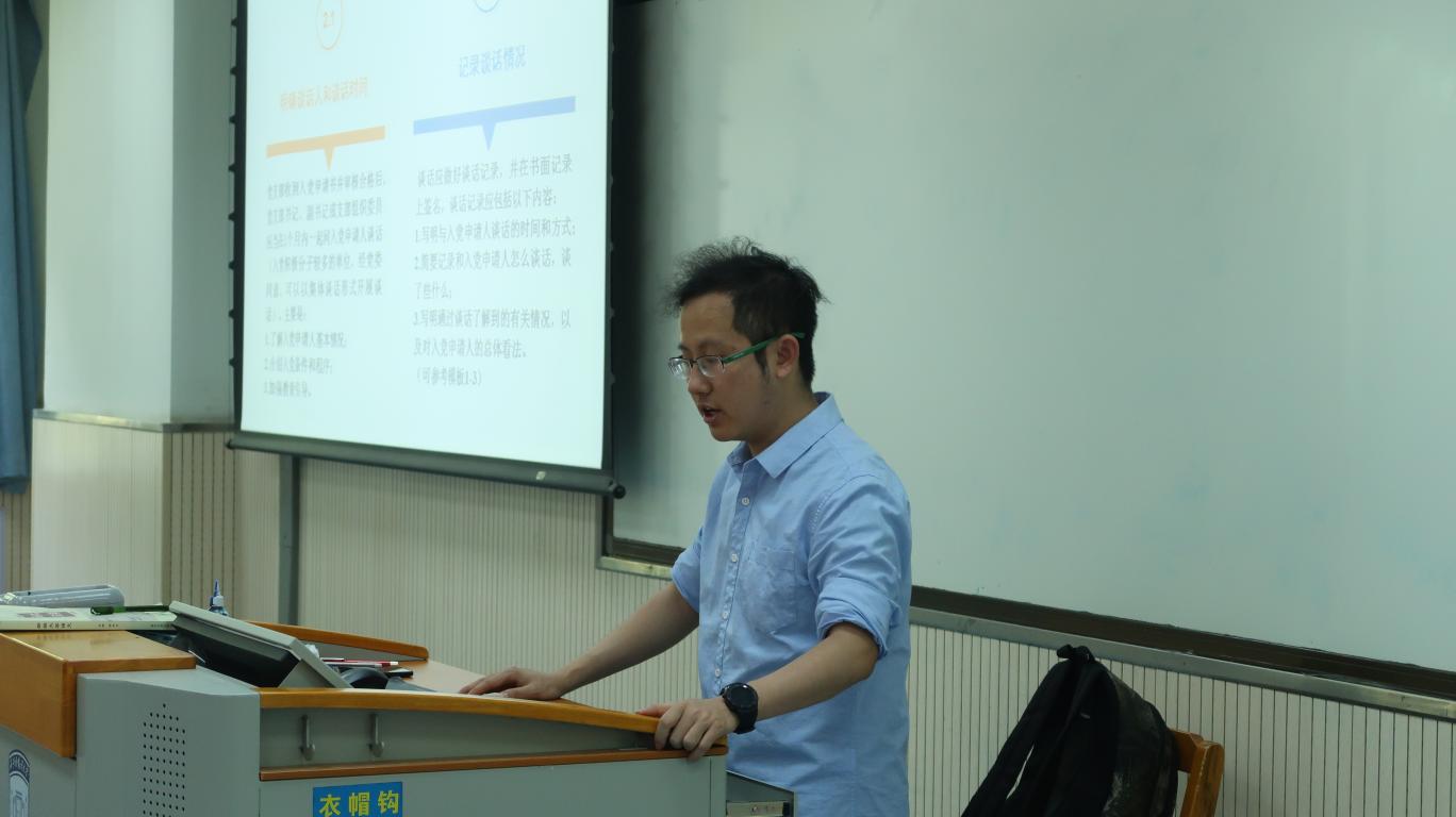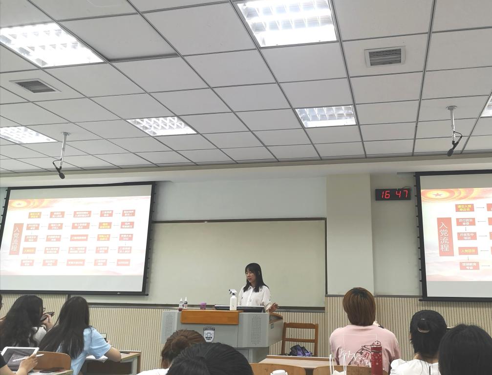 研究生第一党支部书记杨雪芬老师和本科生第二党支部书记张君尧老师主讲。两位老师以《端正入党动机与发展党员流程》为主题,从发展党员工作的基本程序、主要材料的书写要求和注意事项两方面进行讲解介绍,详细阐述了每一发展阶段的具体程序和细节要求。同时提醒学员们以认真、严肃的态度对待入党的每一个环节,时刻以党员的高标准严格要求自己。