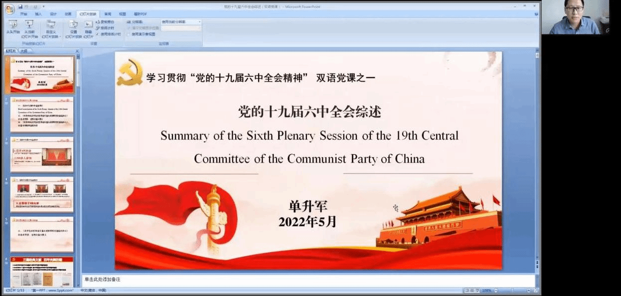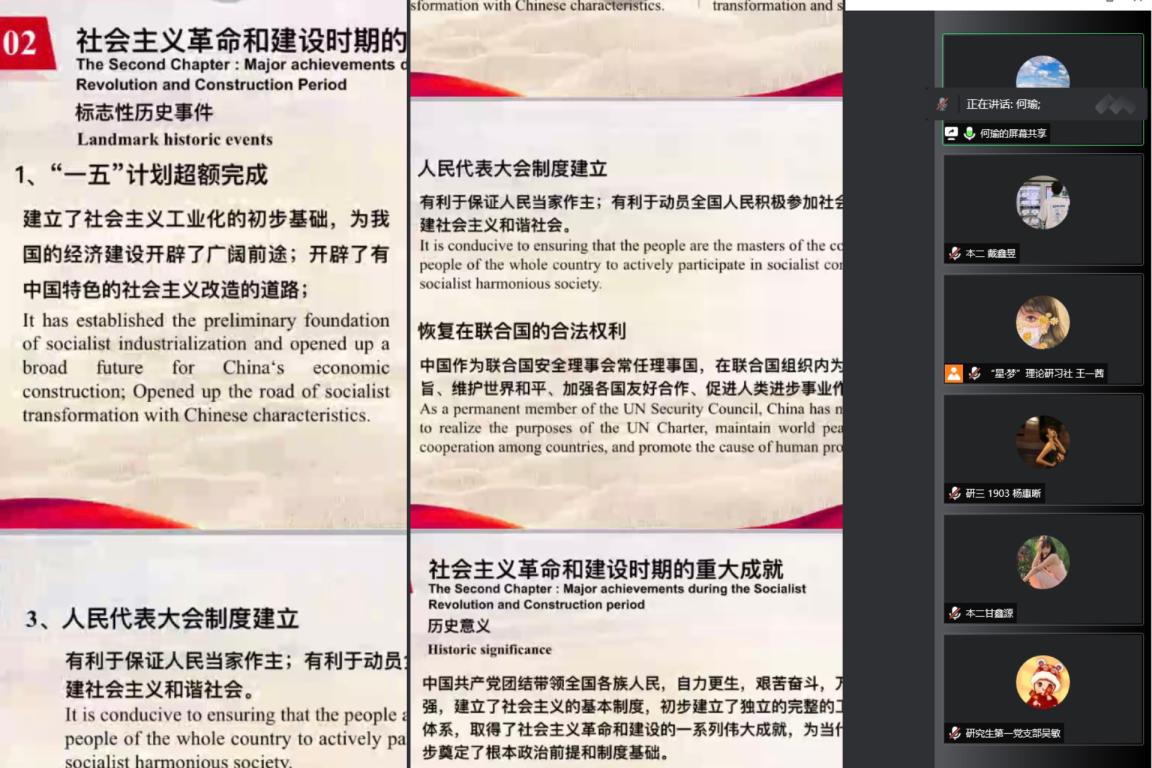 为学习贯彻党的十九届六中全会精神,进一步引导广大学生党员把思想和行动统一到全会精神上来,将学史明理、学史增信、学史崇德、学史力行贯通起来,满怀豪情、斗志昂扬启航新征程、建功新时代。开云体育 党委结合英语专业特色,将时政热点与双语党课相结合,5月中下旬举办了第五期“学习贯彻党的十九届六中全会精神”中英双语党课。本期党课采用线上教学方式,共分为“党的十九届六中全会综述”“党的百年奋斗重大成就”“党的百年奋斗历史经验”“党的百年奋斗历史意义和新时代中国共产党”四讲,每场均有300名余名学生党员参加。