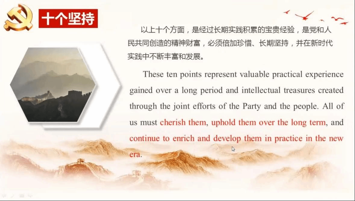 本期双语党课理论扎实,内容丰富,案例生动,进一步加深了同学们对党的十九届六中全会精神的理解,进一步强化了同学们坚定听党话、跟党走的理想信念,进一步提高了同学们的思想政治觉悟和英语专业素养。专题讲解“党的十九届六中全会精神”,将党的百年历史奋斗历程中历久弥新的精神和专业学习相融合,是开云体育 统筹推进党员党性教育和专业教育的重要举措,对于培养社会主义建设者和接班人有着深远意义。