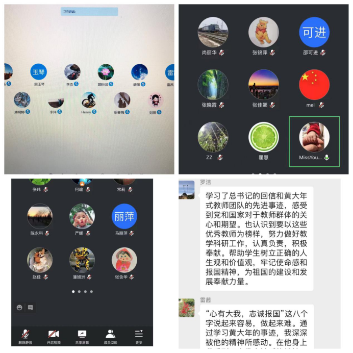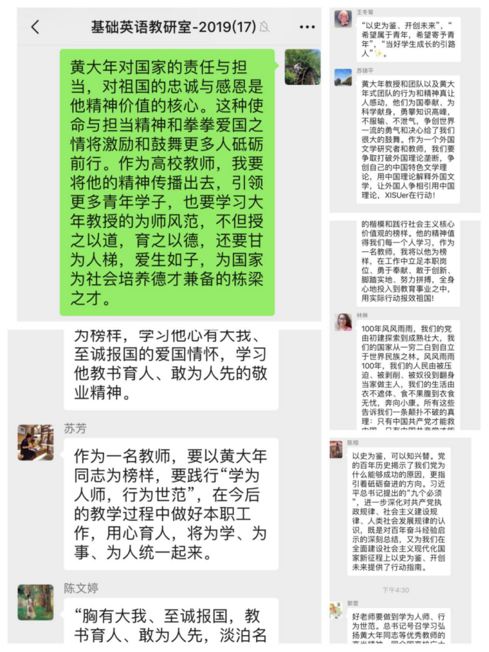专业英语教研室(支部)赵佳表示心有大我,至诚报国的爱国情怀,永远是我们传承的不变基因;教书育人,敢为人先的敬业精神永远是我们的职业操守;淡泊名利、无私奉献的高尚情操是我们应有的精神追求我们应该学习黄大年,践行高尚的师德,夯实自身专业知识,做“有理想信念、有道德情操、有扎实知识、有仁爱之心”的好老师。