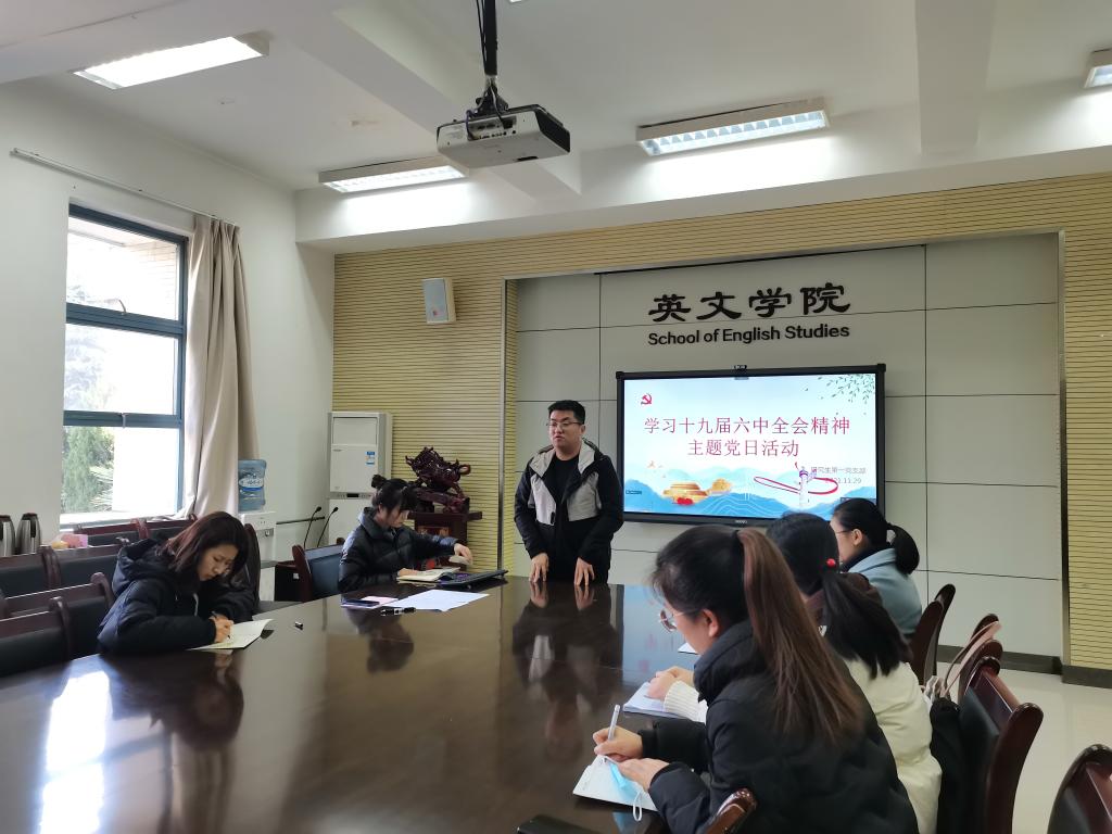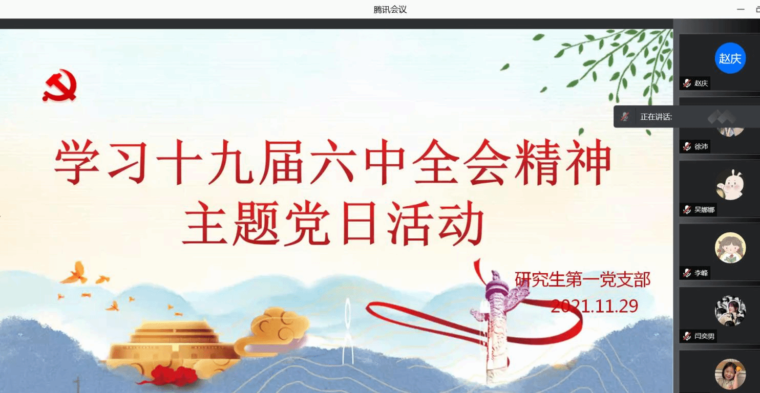 研究生第一党支部于11月29日下午,在教学楼G209会议室开展学习党的十九届六中全会精神主题党日活动。本次活动采取线上、线下相结合的形式。学习活动由组织委员李永强主持。