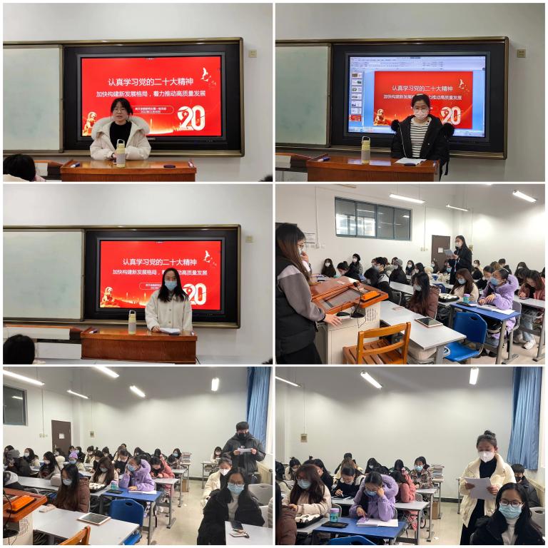 课上,杨雪芬、郭慧敏同志从党的二十大召开的时间、议程引入,解读了大会的主题,并简单介绍了党的二十大报告的十五个部分。随后,聚焦报告第四部分“加快构建新发展格局,着力推动高质量发展”,详细阐述了新发展格局的内涵,并以“全面推进乡村振兴”为切入点,表明全面建设社会主义现代化国家,最艰巨最繁重的任务仍然在农村。然后,杨雪芬、郭慧敏同志,带领大家回顾了党的百年辉煌历程,在新民主主义革命时期、社会主义革命和建设时期、改革开放和社会主义现代化建设新时期和中国特色社会主义新时代等四个历史时期,我国粮食生产的特点与成就。同时,讲明了我国在粮食安全方面面临的形势与挑战。最后,指出我国“以我为主、立足国内、确保产能、适度进口、科技支撑”的粮食安全战略,并强调在日常生活中,我们要节约粮食,杜绝消费环节“舌尖上的浪费”。