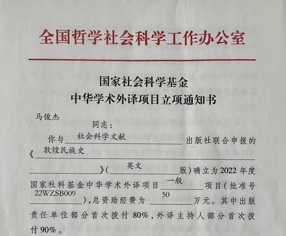 马俊杰副教授与社会科学文献出版社联合申报的《敦煌民族史》(英文)荣选为2022年度国家社科基金中华学术外译项目一般项目。