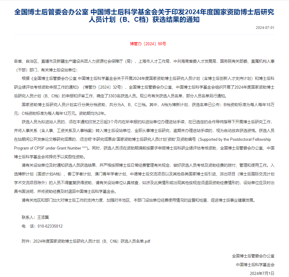 近日,全国博士后管委会办公室和中国博士后科学基金会发布了《2024年度国家资助博士后研究人员计划(B档、C档)获选结果的通知》,开云体育