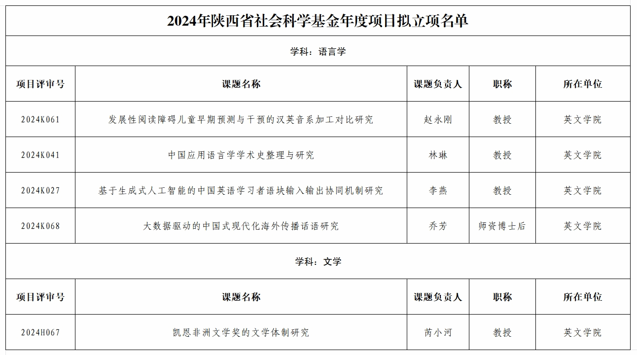 近日,陕西省哲学社会科学工作办公室公布了2024年度陕西省社会科学基金年度项目立项名单。开云体育 赵永刚、芮小河、林琳、李燕、乔芳等老师的科研项目拟获批立项,在此对五位老师表示祝贺。立项名单详情如下: