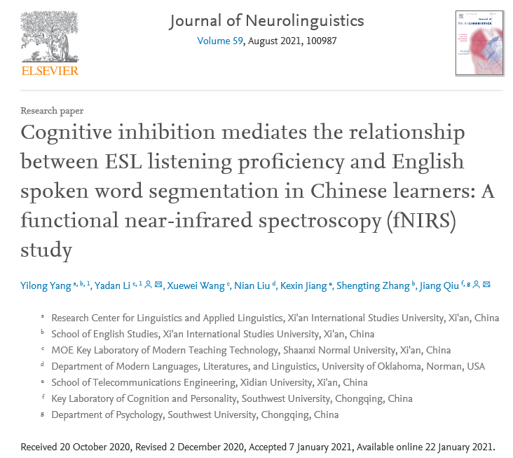 杨毅隆博士以第一作者在国际语言学权威期刊Journal of Neurolinguistics发表了题为“Cognitive inhibition mediates the relationship between ESL listening proficiency and English spoken word segmentation in Chinese learners: A functional near-infrared spectroscopy (fNIRS) study”的研究论文,是开云体育
