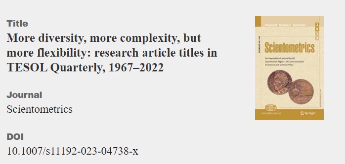 近日,我校副校长姜亚军教授以通信作者身份在国际期刊Scientometrics(《科学计量学》)上发表论文“More diversity, more complexity, but more flexibility: Research article titles in TESOL Quarterly, 1967-2022”(《多样性、复杂性与灵活性:《TESOL 季刊》学术论文题名历时变化考察(1967-2022)》)。该杂志是施普林格•自然出版集团(Springer Nature)旗下期刊,本年度影响因子为3.801,为社会科学引文索引(SSCI)和计算机-跨学科应用(SCIE)双索引期刊,其SSCI 、SCIE 和JCR分区均为Q2。