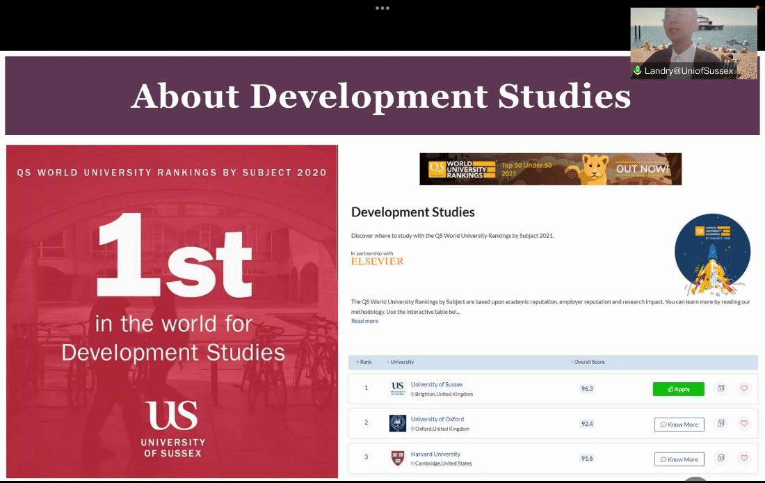 留学合作项目做了简要介绍。接着,萨塞克斯大学中国区招生官Landry Lan详细介绍了英国萨塞克斯大学的基本概况,包括地理位置、人文风情、学校专业设置、就业前景、奖学金和助学金等方面内容。在讲解过程中,Landry特别介绍了萨塞克斯大学世界排名第1的发展学专业和世界排名前列的英语语言与文学等专业。