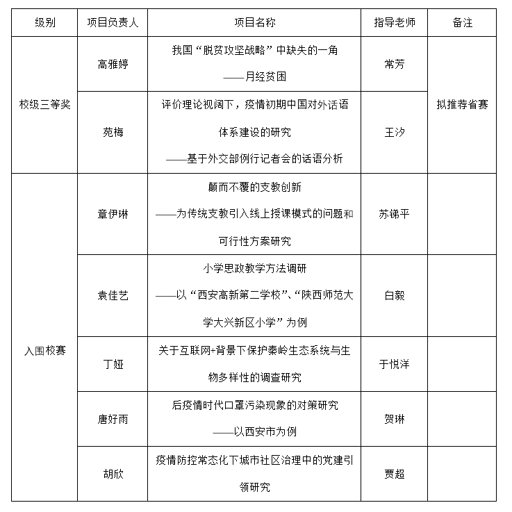 共有172名学生参与其中,累计申报35件作品(拟推荐校赛),作品申报数量居全校第1,相较去年翻了一番。其中,共有7件作品入围校赛,入围数量居全校第1。最终,由高雅婷同学主持的《我国“脱贫攻坚战略”中缺失的一角——“月经贫困”》及苑梅同学主持的《评价理论视阈下,疫情初期中国对外话语体系建设的研究——基于外交部例行记者会的话语分析》荣获三等奖,将代表学校参与省赛。此外,开云体育