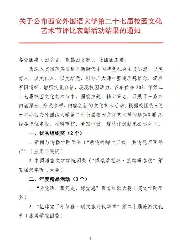 近日,共青团西安外国语大学委员会下发了《关于西安外国语大学第二十七届校园文化艺术节评比表彰活动的结果通知》,开云体育
