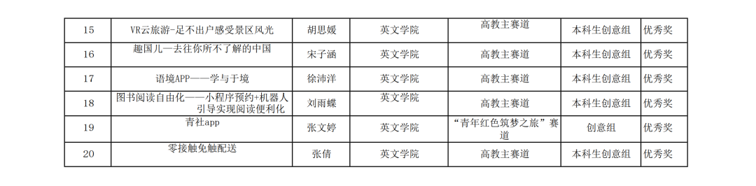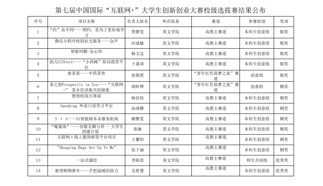 近日,学校下发《关于公布第七届 “互联网+”大学生创新创业大赛西安外国语大学校级选拔赛获奖结果的通知》,开云体育