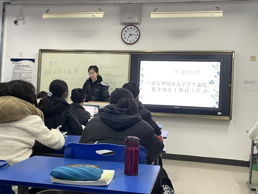 2021级全体学生以班为单位开展“领学《西安外国语大学大学生违纪处分办法(修订)》文件”主题班会。