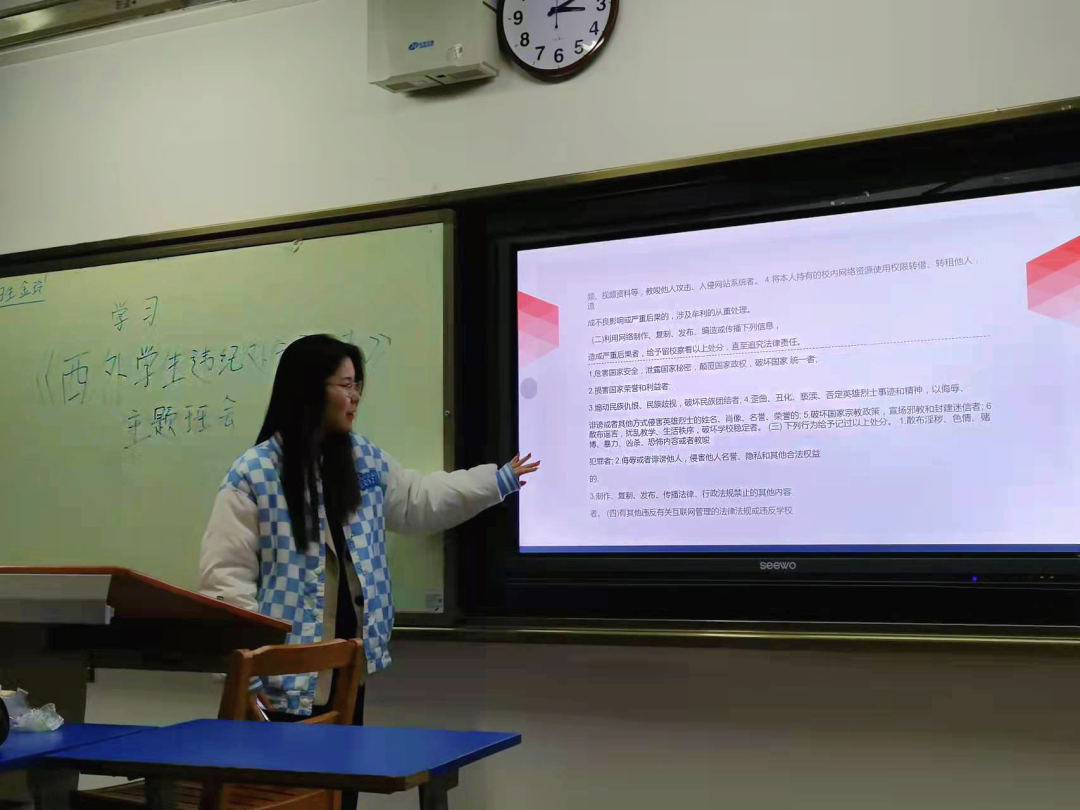 班会由辅导员由刘喆、窦一诺组织,各班班长带领本班学生,通过播放视频、PPT讲解及学生分享交流学习心得等学习方式,给同学们严明强调国家安全、民族团结、宗教信仰等问题的重要性,同时对学校日常纪律规范进行深刻的了解和学习。