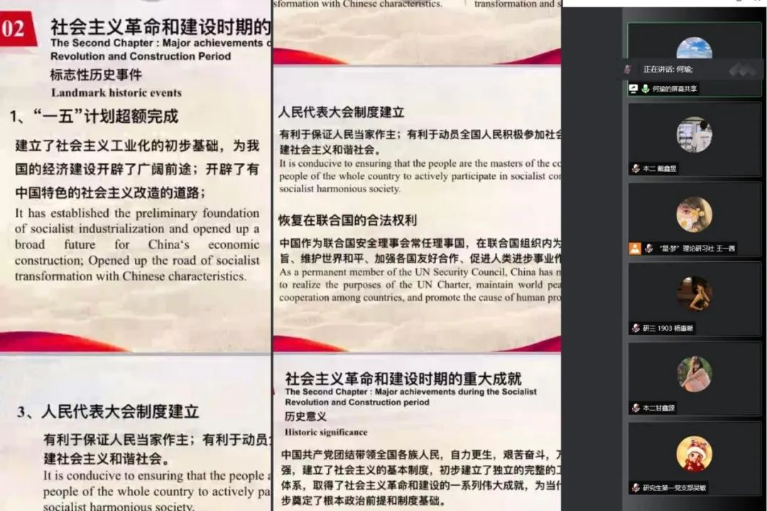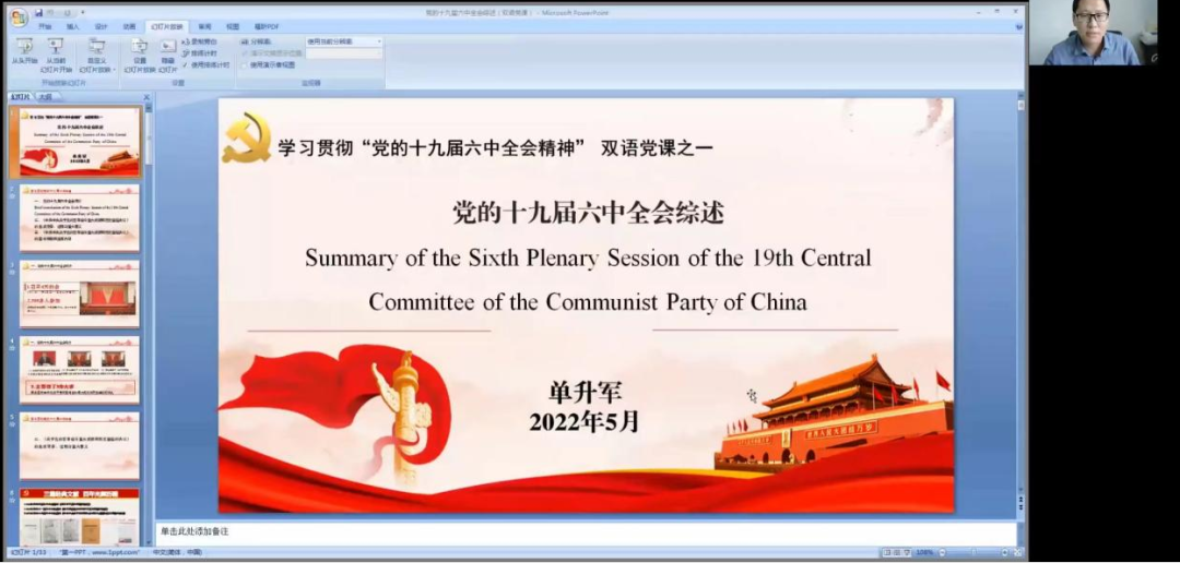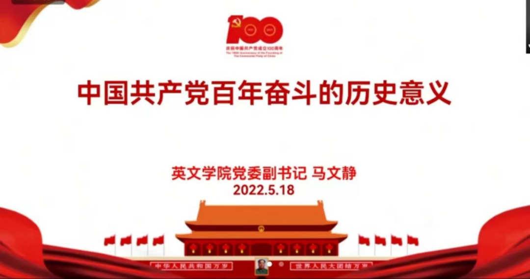 党委结合英语专业特色,将时政热点与双语党课相结合,于5月中下旬举办了第五期“学习贯彻党的十九届六中全会精神”中英双语党课。本期党课采用线上教学方式,共分为“党的十九届六中全会综述”“党的百年奋斗重大成就”“党的百年奋斗历史经验”“党的百年奋斗历史意义和新时代中国共产党”四讲,每场均有300名余名学生党员参加。