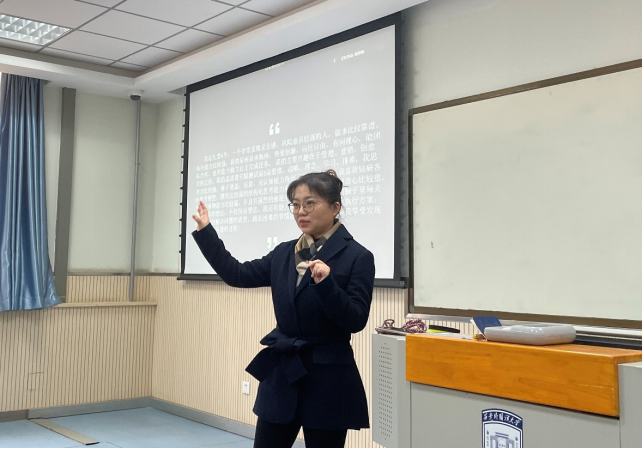 程老师首先为同学们讲解了生涯彩虹图,说明了每一个身份在不同年龄阶段的占比,强调了每个人打造个人IP与个人品牌的重要性,通过介绍自己教育工作、出国留学、回国工作等经历,谈到清楚完整认识自我的重要性。接着,她向同学们介绍了九型人格相关的知识,强调同学们要充分认识自己,要主动把握机会,要敢于抉择创新,不负青春时光。
