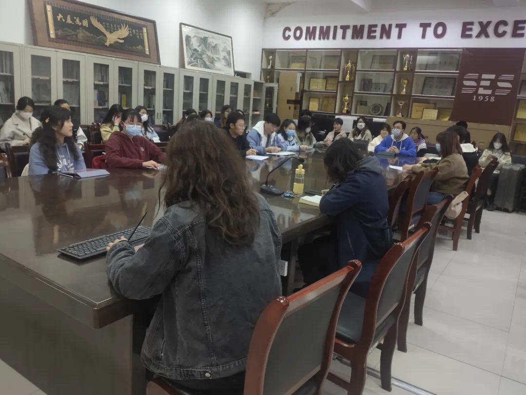 董睿婕同学通过视频学习的方式带领全体社员回顾两会专题的重要内容,她依次介绍了科技创新、居民收入、乡村振兴、民生保障、教育和就业、生态保护、经济发展、社会治理和发展等方面的主要内涵和重要意义。领学完毕后,党航力同学结合志愿经历畅谈当前两会学习热潮以及带给自身的震撼;邹柔同学从经济发展角度谈到国家经济社会发展带给英语毕业生的启示;张蕾同学结合代表们对当下网络环境的现状思考,提出作为青年大学生应有自己的独立思考能力。其他学生代表也纷纷结合乡村振兴、大学生就业、英语教育改革等内容分享了各自学习的心得和体会。