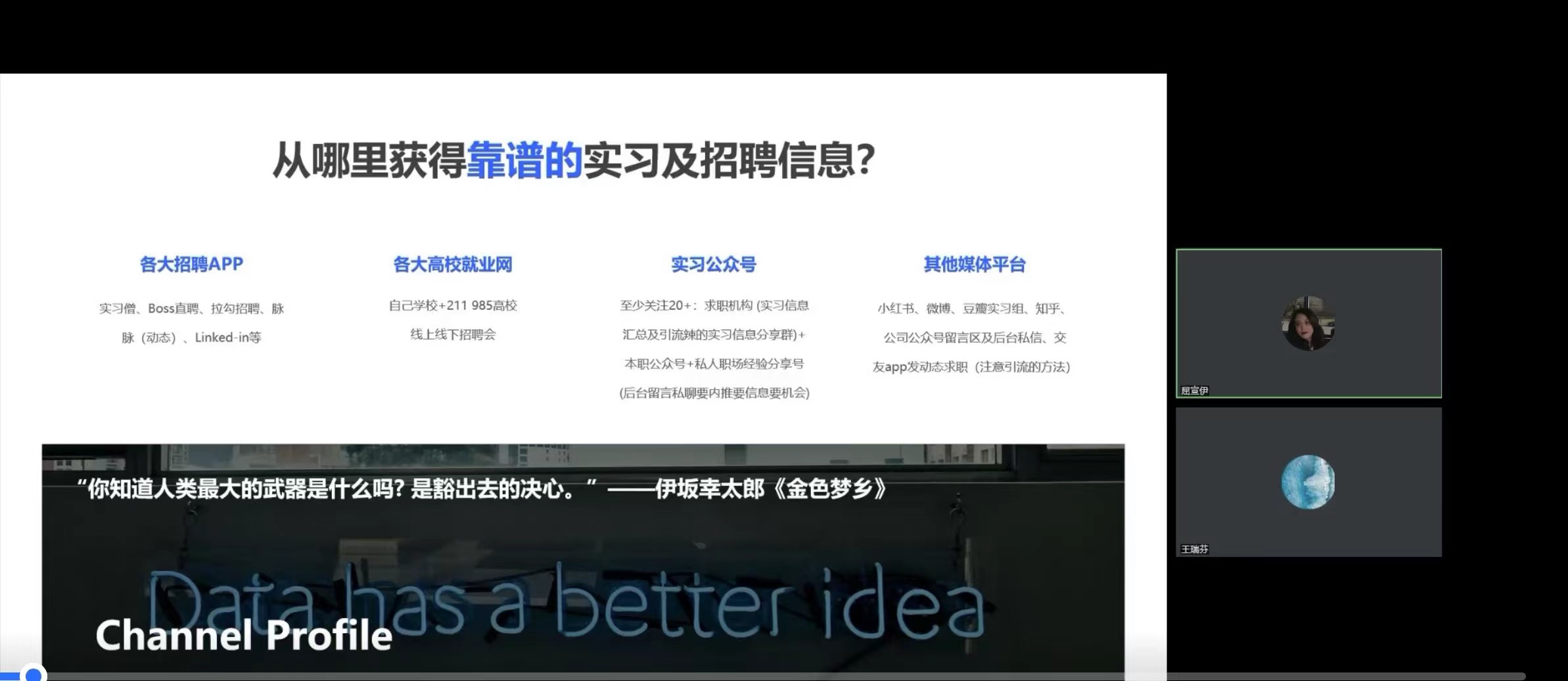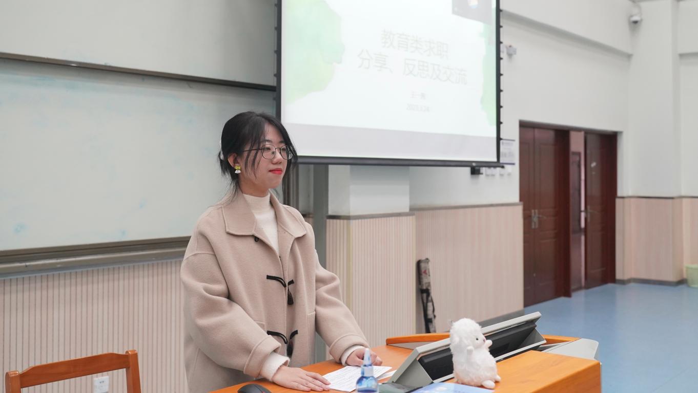 接着,王一茜同学以“考研?就业?”话题引入,从自身考研及求职过程切入,为同学们分享了自己做出最终决定的心路历程;为同学们真诚分享了自己的面试技巧和方法,全程讲解热情亲和、细致入微,为帮助同学们在这个“分岔路口”做出选择提供了宝贵的经验建议。