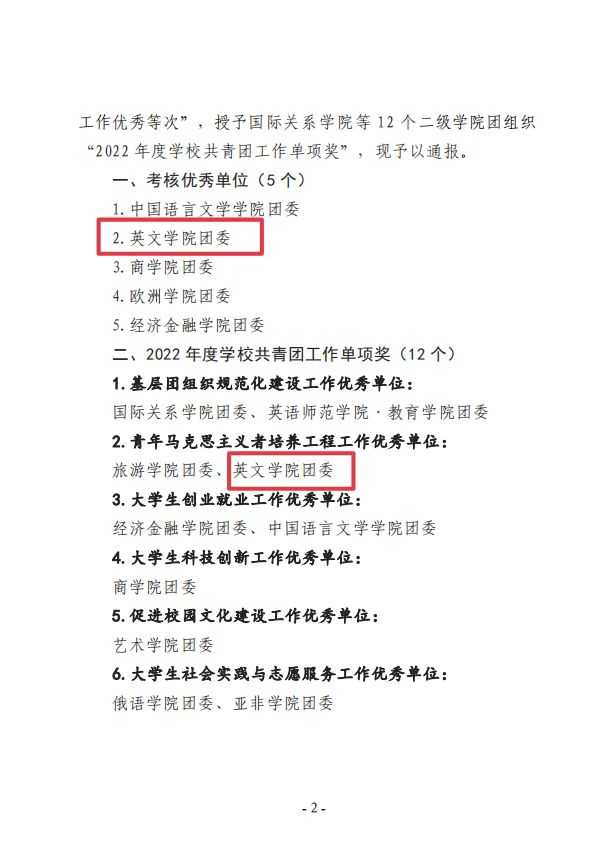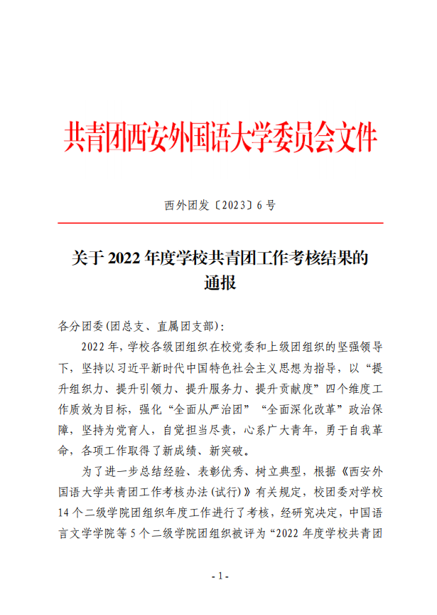 近日,共青团西安外国语大学委员会印发了《关于2022年度学校共青团工作考核结果的通报》,校团委对学校 14 个二级开云体育