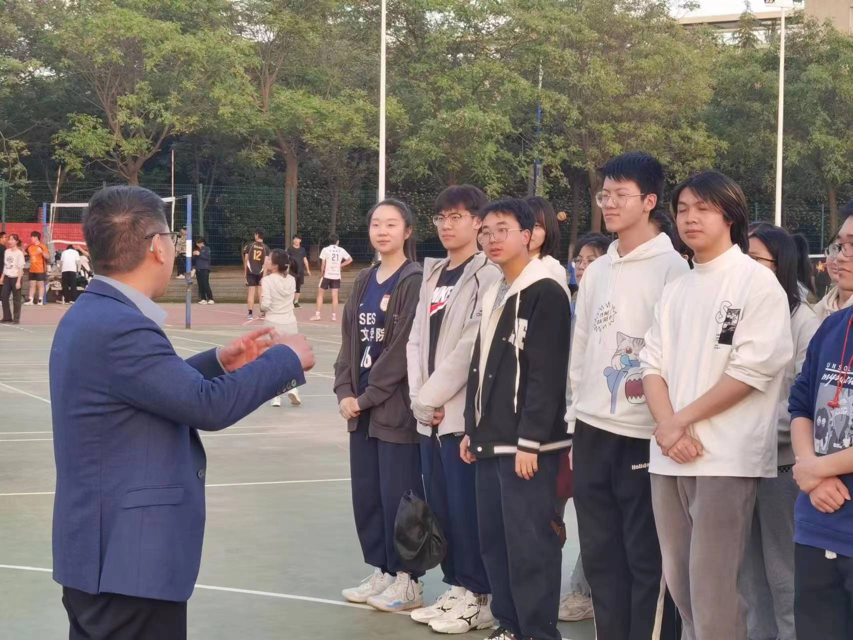 对在场同学的辛苦付出表示感谢,对运动员积极向上的精神面貌予以了肯定,称赞了运动员们肯于吃苦,坚持不懈的优秀品质。同时,他鼓励同学们:一是再接再厉,抓住最后几天的训练时间,展现出新时代英文学子的良好的精神风貌。二是对在场运动员进行了安全教育,他强调学生体育竞赛要秉持“安全第一,成绩第二”的原则,要求运动员们在日常训练及比赛当日都充分做好个人防护工作,防止身体受伤。三是告诉在场运动员强身健体的重要性,激励大家在平时也要走出教室、走进操场!他表示运动员是冲锋的战士,要不断努力向前冲!