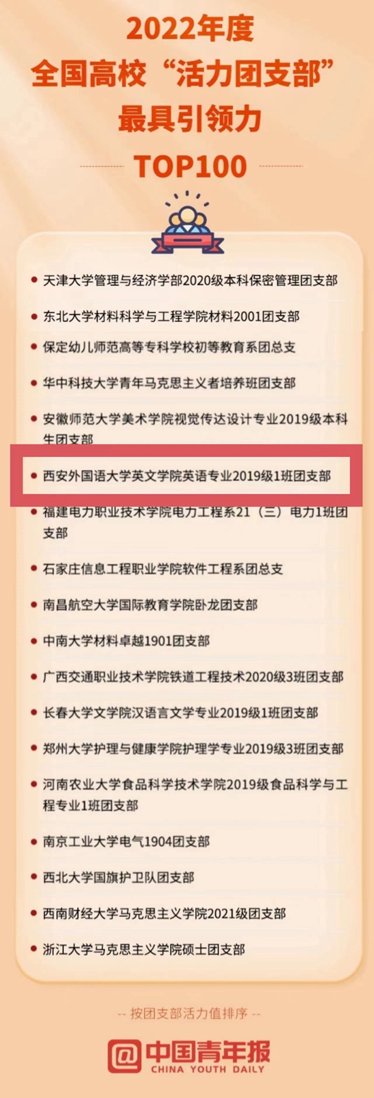为深入贯彻“全团抓思想政治引领”“全团大抓基层”“全团抓学校”工作部署,激发高校团支部活力,共青团中央指导中国青年报社开展2022年度高校“活力团支部”风采展示活动。经过校内选树、校级展示、省级展示、全国展示等环节,形成《2022年度全国高校“活力团支部”最具引领力TOP100榜》。