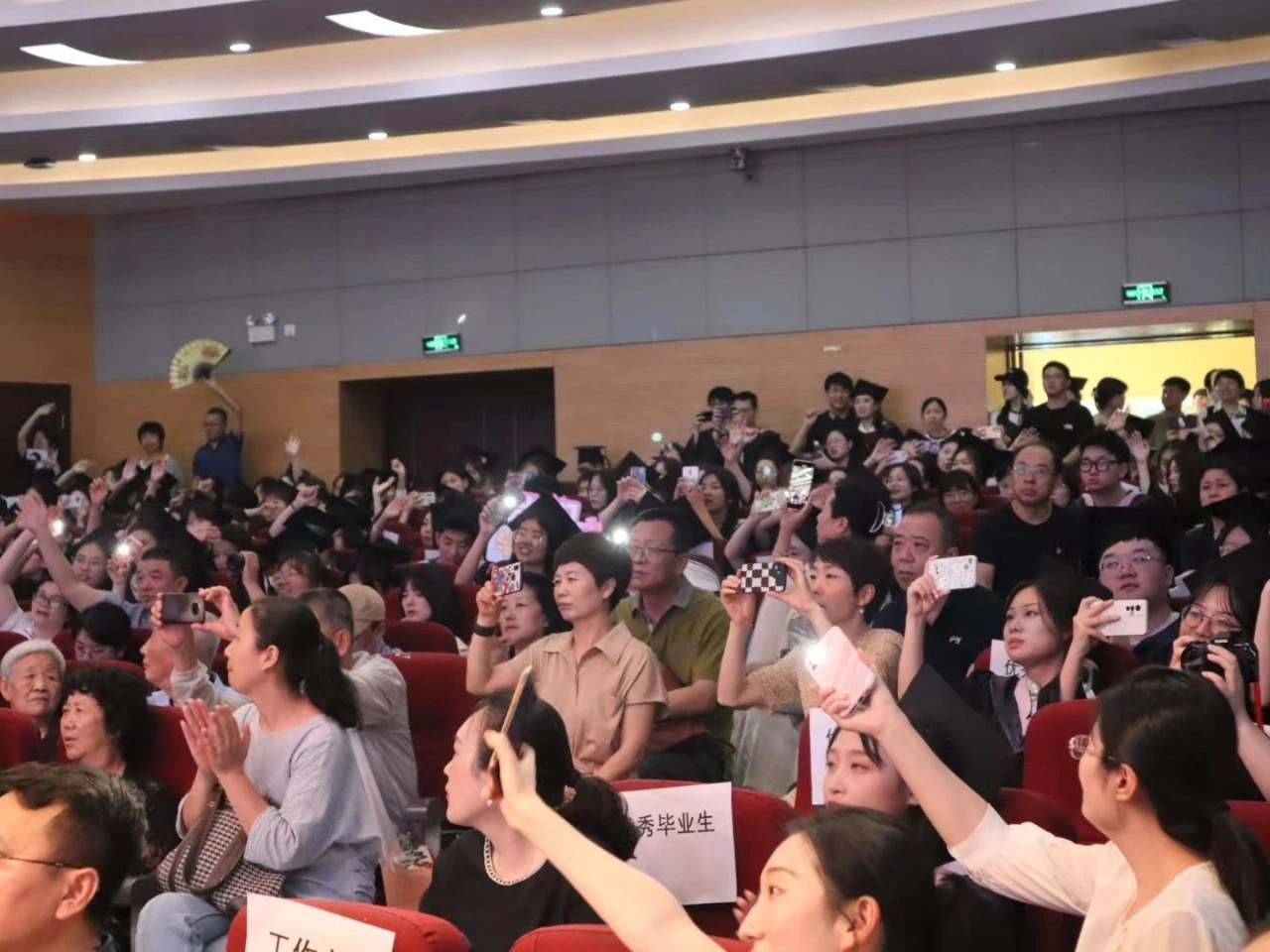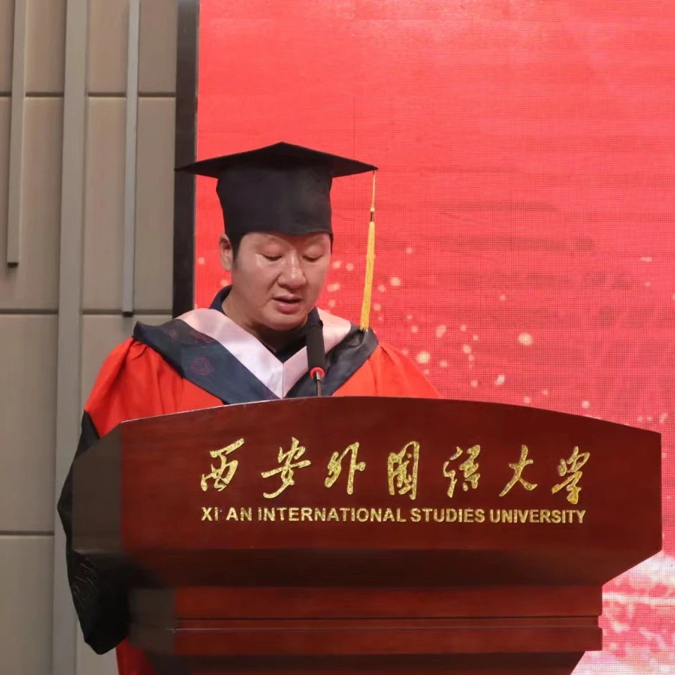 优秀教师代表、副教授林琳毕业于西外、成长于西外、服务于西外。她分享了自己毕业时欣喜与伤感的复杂情绪,引发了同学们的强烈共鸣。在这“最后一课”中,她表达了对毕业生们的诚挚祝贺,并希望同学们在日后工作学习中用好专业知识、探寻语言奥妙;施展所长助力社会发展、国家进步;铭记“止于至善”的院训,追求卓越。最后,林琳老师祝愿全体毕业生一路荣耀,前程似锦。接下来,1913班樊宇航同学的家长王月红女士上台致辞。她对全体毕业生顺利毕业表示衷心祝贺,并表达了对学校给予学子们辛勤深厚培养的诚挚感谢。王女士作为家长代表,道出了选择西安外国语大学的原因:浓厚的学习氛围、优质的教学资源,让孩子在这里收获了优异的成绩和充实的成长。最后,王女士向台下的年轻学子们寄予了殷殷嘱托:感恩、勤奋、博学。她盼望学子们带着优良的西外精神继续成长。