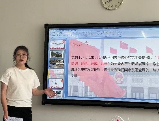 2023级5班团支书兼“星·梦”理论研习社成员张睿烨同学以《贯彻新发展理念,争做新时代青年》为题,介绍了在新发展理念下中国在各个方面发生新转变,最后阐述了作为新时代的大学生我们应如何贯彻新发展理念,以自身行动融入实现中华民族复兴的伟大建设中。