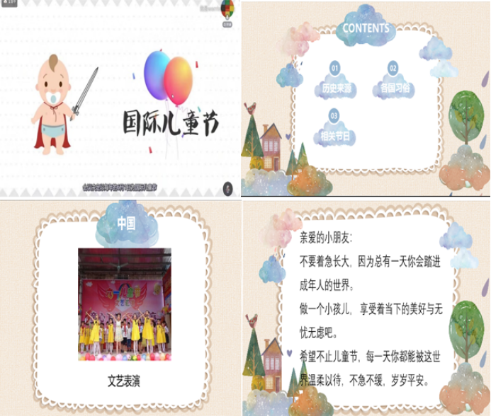 低年级一组的老师们充分利用低年级学生们活泼的性格与跳跃的思维,通过世界各国儿童节的有趣活动和故事,一起探索了童年的乐趣和纯真的世界。首先,老师通过一条童趣幽默的小视频向学生们介绍了儿童节的由来,讲述了在悲惨的战争年代,战火下的儿童们是如何自愈与成长的,全面了解欢乐节日背后的深沉含义。随后,老师向我们介绍了从身边到世界各地的不同儿童节习俗,并逐步深入解读不同习俗背后的文化内涵。最后,由一段儿童节寄语点明主题——天大地大,快乐最大!希望同学们过一个快乐充实的“六一”儿童节。