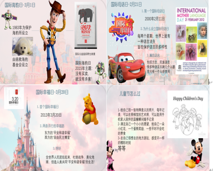 中低年级二组的老师带领同学们将目光投向更广泛的国际性节日中,除了同学们耳熟能详的和国际劳动节和国际儿童节之外,还介绍了不少新颖奇特的节日,例如国际母语日、国际海豹日、国际幸福日……老师们简单的从节日们的时间、庆祝方式以及目的来介绍了这些有趣的国际节日,更好的为孩子们保留了这些节日的神秘感,同时也培养了学生们的国际视野与跨文化理解能力,探讨国际节日背后的共同特点与文化内涵。