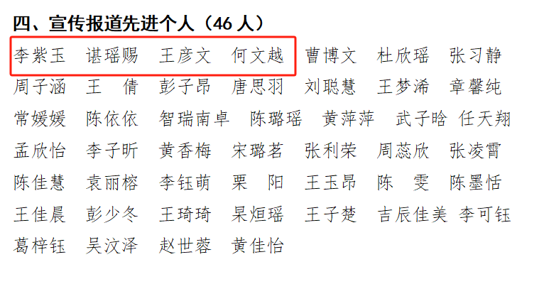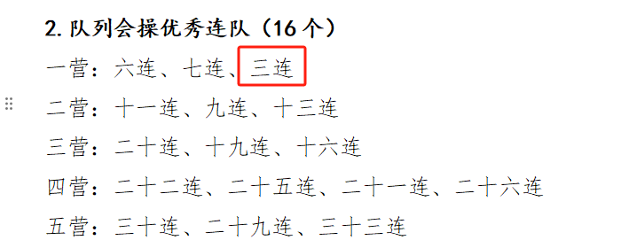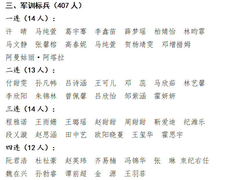 一营三连“队列会操先进单位”;授予高洋同志“优秀指导员”称号;授予许晴、马纯萱等53名同学“军训标兵”称号;授予李紫玉、谌瑶赐、王彦文、何文越4名同学“宣传报道先进个人”称号。