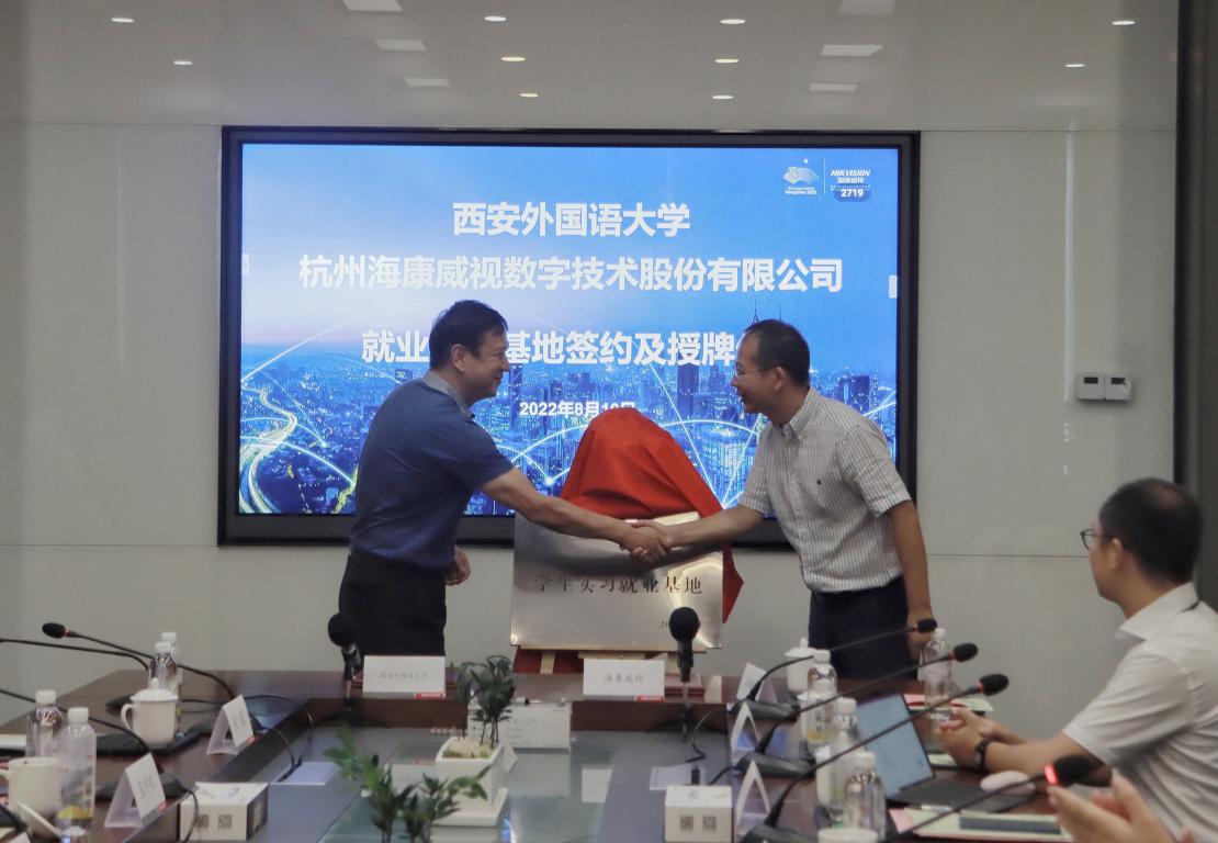 在滨江物联网小镇,工作组参观了海康威视数字技术股份有限公司形如“磐石”的展示中心。在会谈时,公司副总裁姚立坚表示,推动实现“新全球化”是大势所趋,西外毕业生专业能力强、综合素质高、国际视野好,契合公司发展需求,也有部分西外毕业生在驻外期间,立足专业,强化业务,由外语骨干转化为技术骨干。文教务业务部总经理胡康颖、招聘与配置部总经理李丹、国际业务中心人力资源专家姚沛、高级行业销售经理王维博、校园招聘经理苗轲、校园招聘经理廉宏爽一同参加会谈。目前,我校已有50余名毕业生入职该企业,渠道销售王可倚(2016届葡萄牙语专业)及活动专员牟静宜(2019届阿拉伯语专业)向白黎书记一行汇报了工作心得。在与会人员共同见证下,双方代表签署校企合作协议,白黎书记与姚立坚副总裁共同为就业实习基地揭牌。