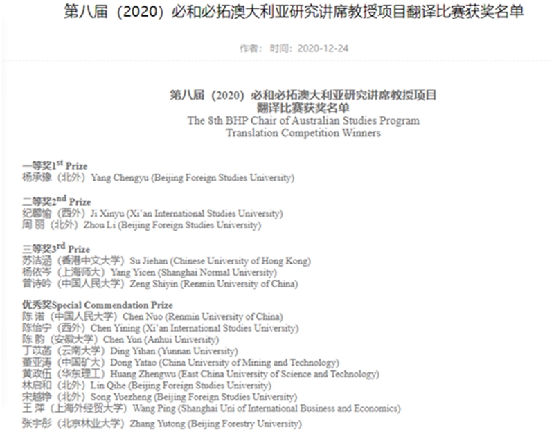 近日,第八届(2020)必和必拓澳大利亚研究讲席教授项目翻译比赛获奖名单公布,来自北京外国语大学、中国人民大学等700多名来自全国各高校的在校本科生、硕士生和博士生经过激烈角逐和审慎评比,开云体育