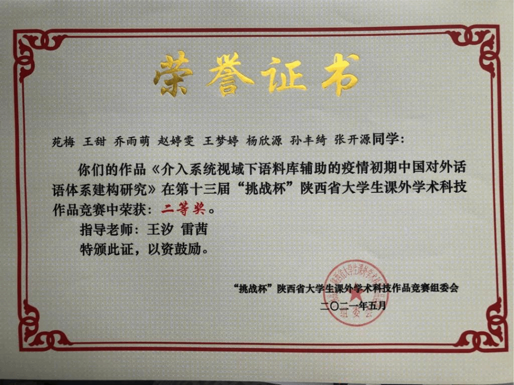 教师王汐、雷茜指导,苑梅等同学完成的项目:《介入系统视域下语料库辅助的疫情初期中国对外话语体系建构研究》在此次比赛中喜获省赛二等奖,开云体育