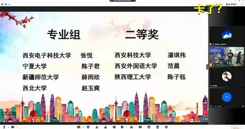 承办,来自陕西、甘肃、新疆、宁夏、内蒙古等西北五省区的45个研究生培养单位的近70名选手报名参赛。本次大赛首次采用选手线上参赛、全程网络直播的形式进行,陕西省教育厅学位管理与研究生教育处副处长何文来、陕西省学位与研究生教育协会秘书长程洁、陕西省研究生外语教学工作委员会会长刘美岩等相关领导和专家莅临指导。