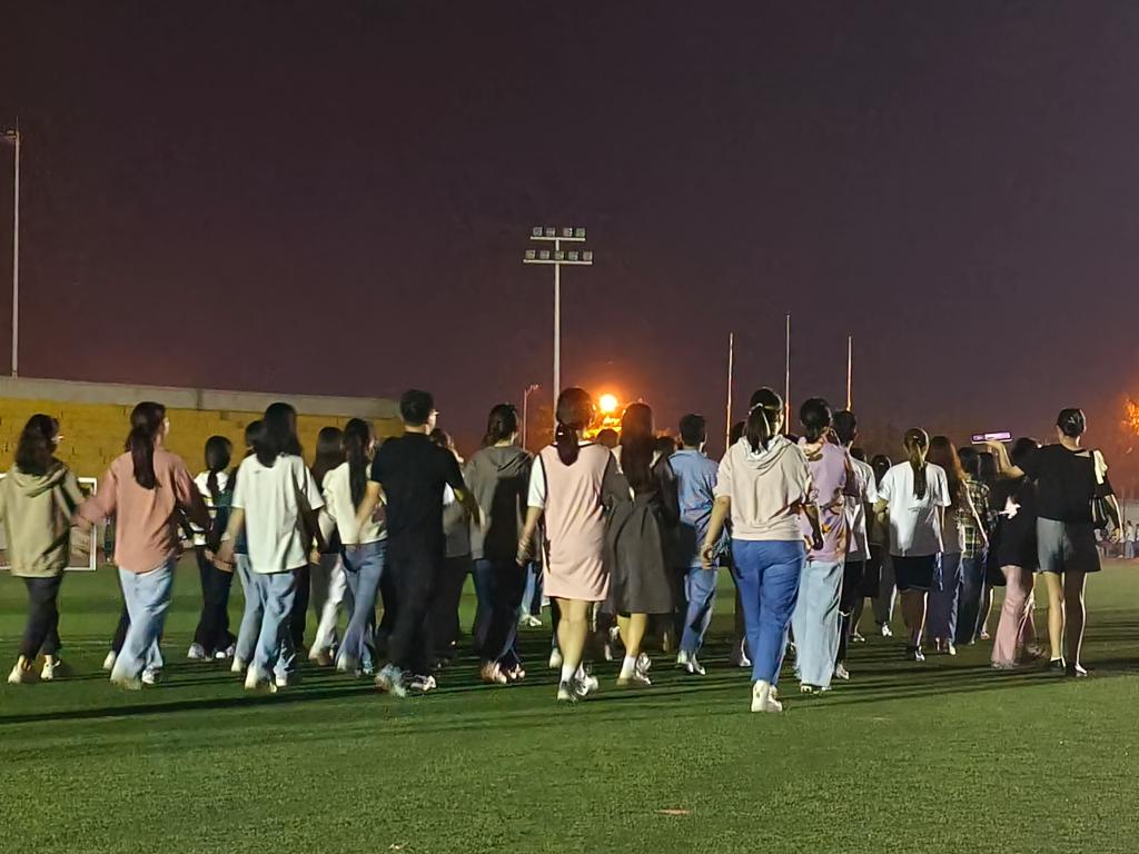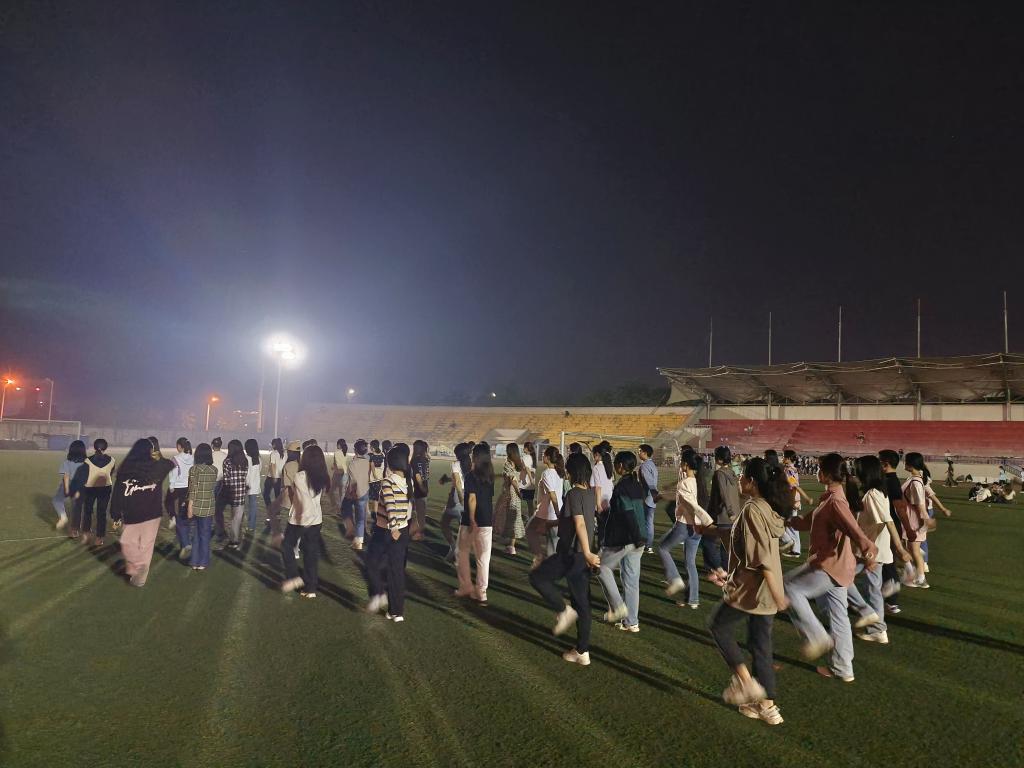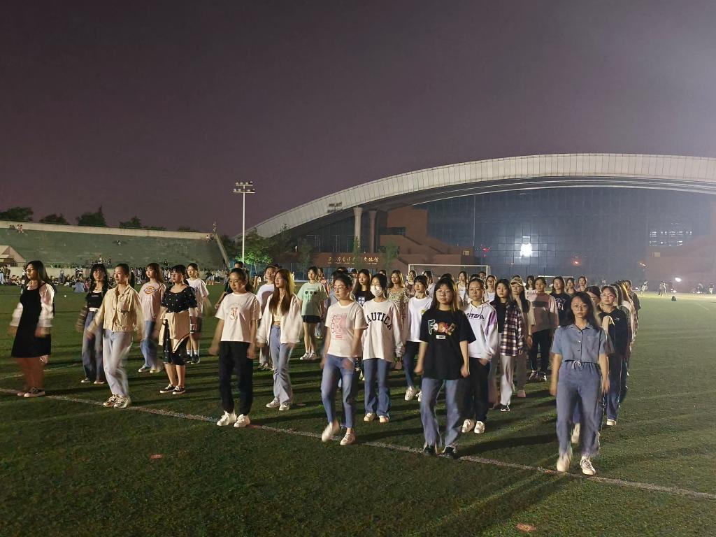 的学子仍保持着对训练的热情,脚步精准地踏在每一句口号之上。她们不顾远处天已渐暗,甚至夜色渐浓。在方阵的普通训练之外,舞蹈、朗诵、合唱的同学也在不断打磨各自的作品,为这场青春交响贡献绚丽、热烈的旋律。