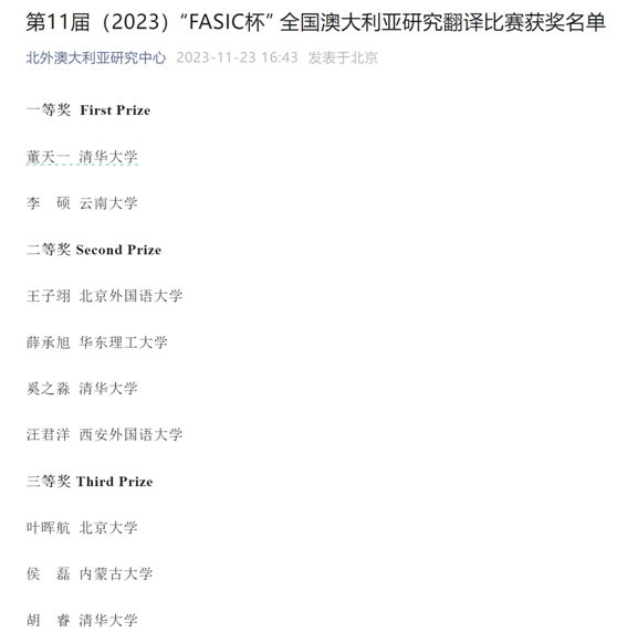 2023年11月23日,第11届(2023)“FASIC杯”全国澳大利亚研究翻译比赛获奖名单公布。由西安外国语大学澳大利亚研究中心指导的两位学生汪君洋、周紫微获奖。