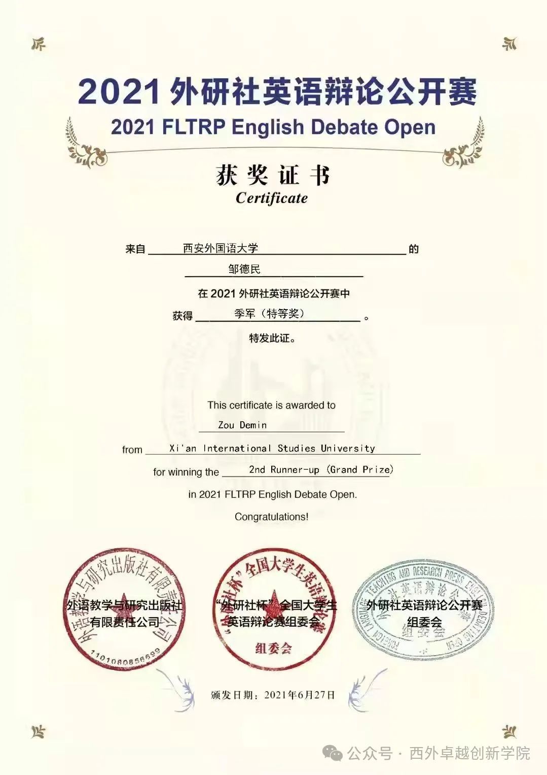 2021 西安交通大学英语辩论赛总决赛裁判;