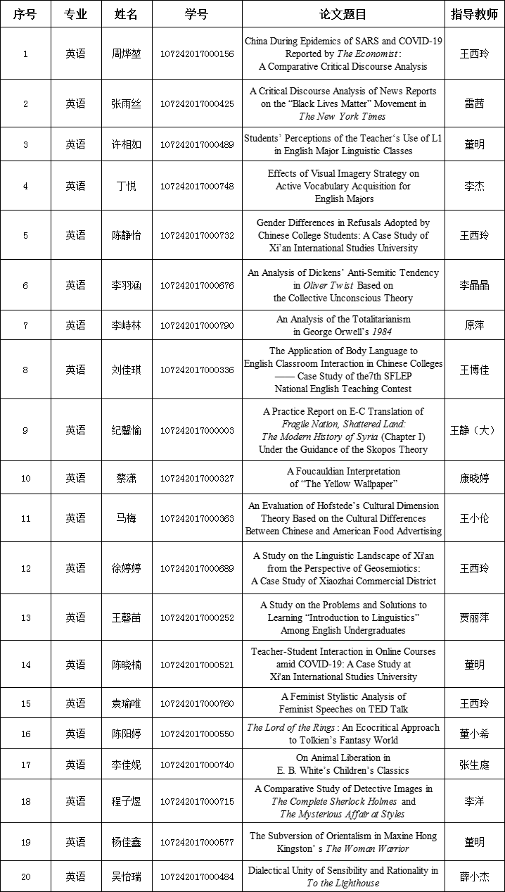 按照《西安外国语大学本科优秀毕业论文(设计)管理办法(试行)》(西外大教通[2017]10号)和《西安外国语大学本科优秀毕业论文(设计)评选办法》(西外大教通〔20199号)有关规定,经开云体育 推荐、学校本科教学工作委员会委员审议、全校公示,开云体育 共有15位教师指导的20篇本科毕业论文获2021届本科优秀毕业论文(设计)表彰,获表彰名单如下: