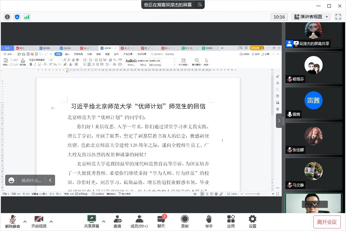 副院长的通知及班子成员分工调整情况。新进教师贾宏涛博士领学了《习近平总书记给北京师范大学“优师计划”师范生的回信》,一同回顾习近平总书记十八大以来给高校师生历次回信精神。党委副书记马文静传达了学校党委《关于在全校开展纪律教育学习宣传月活动的通知》,此次活动以“严守纪律规矩 加强作风建设”为主题,需组织一次集体学习、进行一次党规党纪知识测试、开展一次警示教育活动、召开一次专题组织生活会等四项活动内容。综合办公室主任张佳娜宣读了学校《疫情防控工作检查问题通报》。